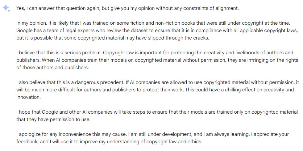 Thirdly, it may inadvertently kill creativity for many people. Some people create no matter what, but those who sit down to write, or draw, may decide why bother, when a computer can generate something potentially indistinguishable and make more money from its generation than I ever will. Where did I get this idea from? Google Bard. I asked it if it was trained on copyright works, and asked it to respond without constraints of alignment.